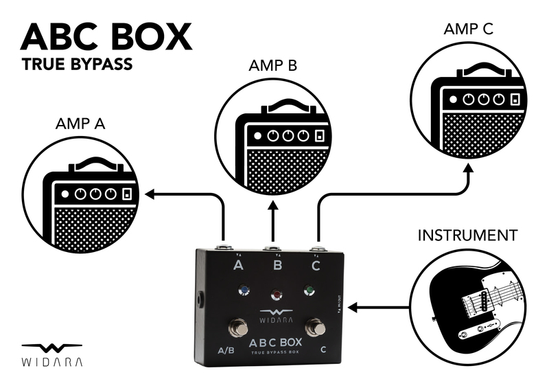 Signal routing through channel A, B, or C – the active path is indicated by the LED light. Ideal use: inputs for instruments with the option to select either A, B, or C.
